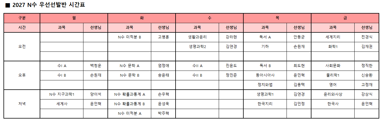 | 2027 N¼ö ¿ì¼±¼±¹ß¹Ý ½Ã°£Ç¥ | |||