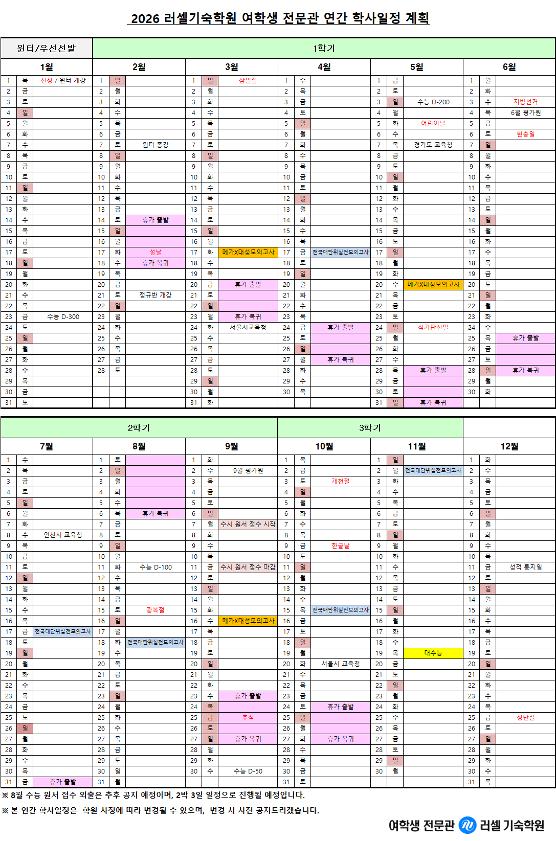 ¡Ø º» ¿¬°£ÇлçÀÏÁ¤Àº Çпø »çÁ¤¿¡ ÀÇÇØ¼ º¯°æµÉ ¼ö ÀÖ½À´Ï´Ù. º¯°æ ½Ã »çÀü °øÁöÇϵµ·Ï ÇϰڽÀ´Ï´Ù.